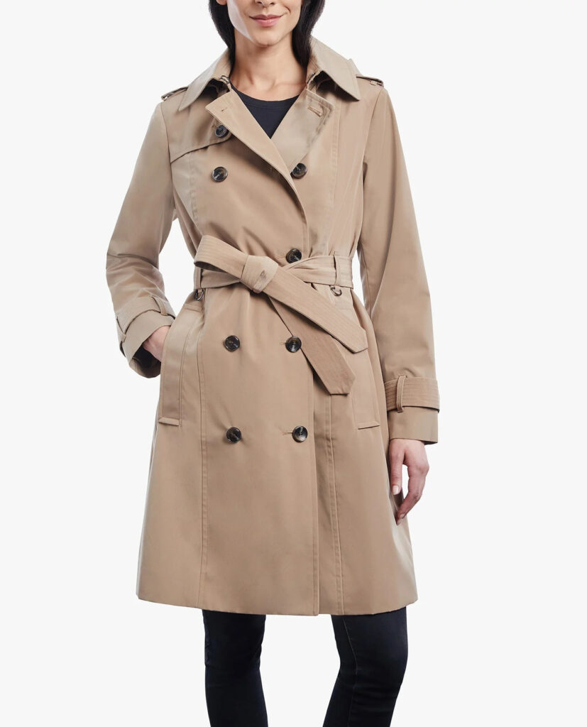 Epaulets, buttoned storm flaps, belt buckles, and double-breasted fronts bring that signature trench authenticity.